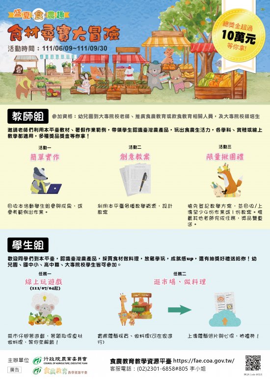 四、 | 為使大家孰悉平臺功能,該會舉辦「盛夏食農趣:食材尋寶大冒險」活動,總獎金超過 10 萬元,歡迎各級學校師生、食農老師及大專院校師培生踴躍參加。 |