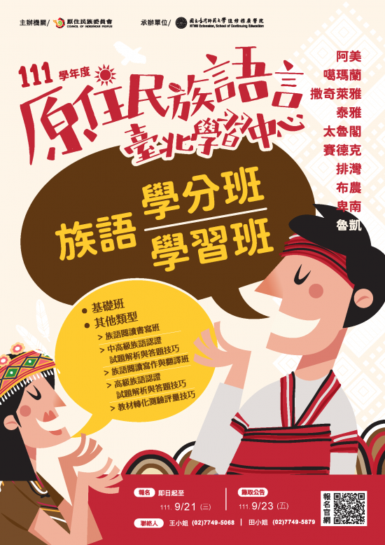 臺師大辦理原住民族語言臺北學習中心「111學年度第1期族語學分班暨學習班」