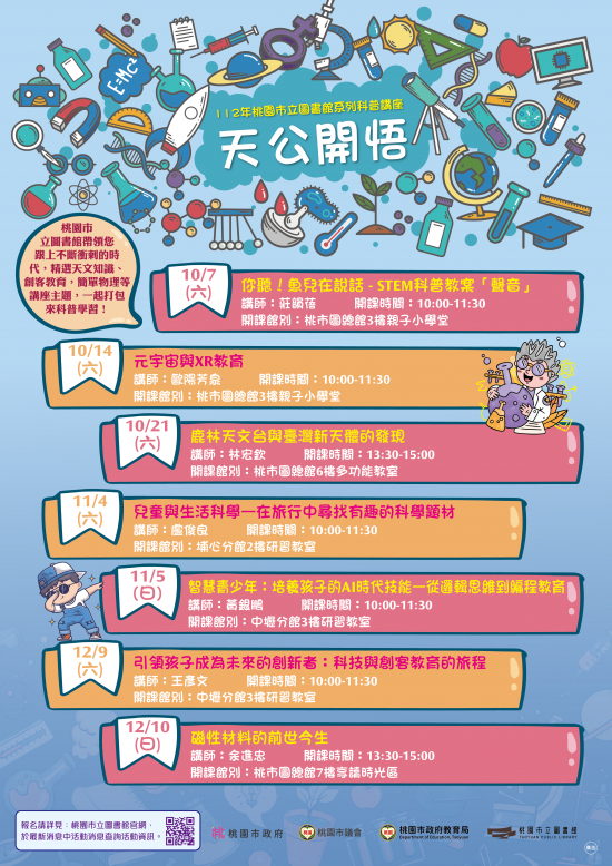 一、隨著科技的快速發展,社會正面臨一個充滿挑戰和機遇的 時代,桃園市立圖書館將舉辦一系列的科普講座,講座包括 STEAM 教 育、天文教育、簡單物理等多元主題,歡迎老師、學生及 民眾參與,期望帶讀者們了解相關科普知識和技能,提升 人們的科學素養,以因應現代的挑戰!