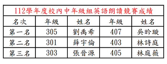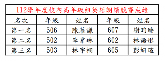 112學年度校內英語朗讀比賽成績公告
